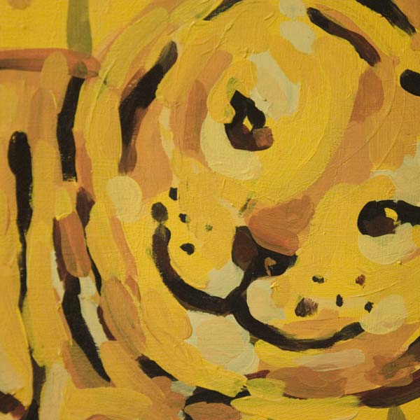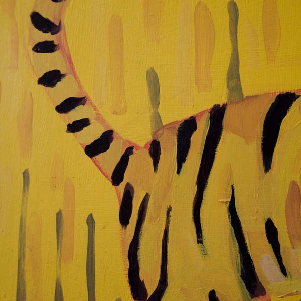 Obraz w tonacji ciepło żółto-pomarańczowej. Ekspresyjny mimo figuratywności. Sylwetka tygryska nawiązuje do charkterystycznych cech gatunku, ale jest stylizowana. Tło jest płaskie i dekoracyjne sugerujące przestrzeń łąki, nadają kompozycji rytm i dynamikę. Tygrys sprawia wrażenie pogodnego i ciekawskiego, a całość utrzymana jest w lekkim, ilustracyjnym stylu.